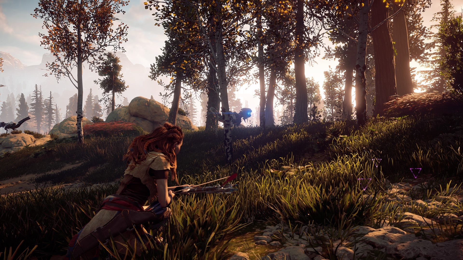 Introduction to post-apocalypse of this game is the perfect hit. Aloy knows the world beyond the small pieces of folders that you offered in the prologue. Begining itself lasts a long time, about two hours, and just when you limited territory becomes constricted, Aloy in wonder out in the rest of the world not knowing what there is – just like you do not know. I wish only that the developers completely blurred folder that size or a huge world to be a surprise for the players. This is the start to see where you can go, but at least you do not know what type of terrain in front of you – is that forests, jungles, deserts, frozen ground and the like.
